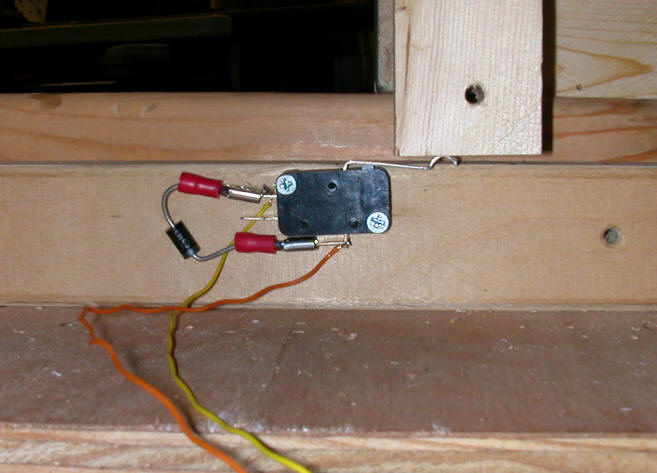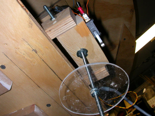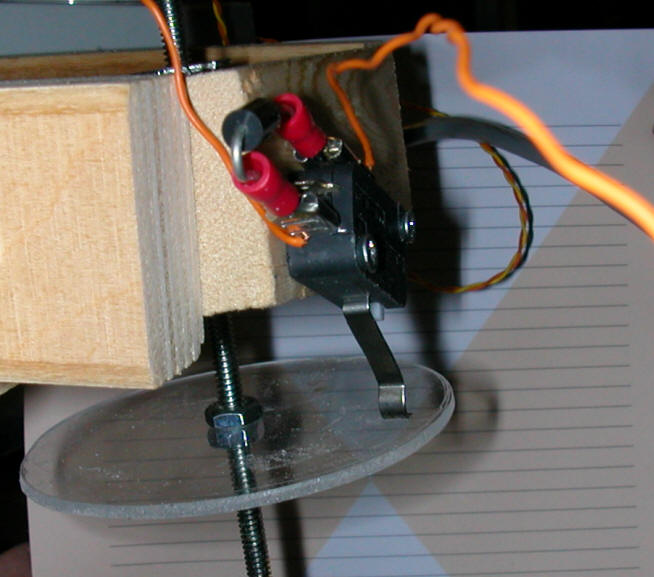 The upper limit switch is also wired with a diode. It is tripped by a rotating circle of Plexiglas that is attached to the threaded rod. Attaching it to the rod allows the upper limit to be easily adjusted by moving the disk.