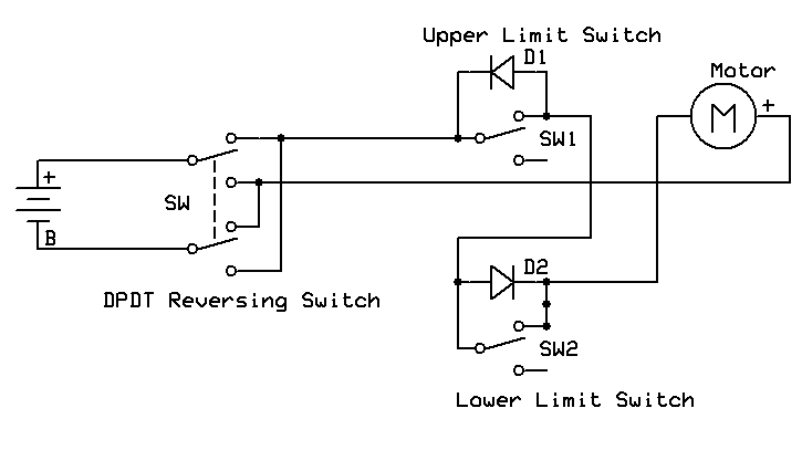 | Motor Modification & Limit Switches The motor shown above works well when lifting and lowering the platform but, even when run at 20+ volts, takes nearly 10 minutes to lift the table to a 10 degree angle. Another motor with a different gearing ratio was installed. It raises and lowers the table much faster as the shaft rotates more than 8 times as quickly. In addition limit switches were installed to stop the motor when the upper and lower points are reached. The lower limit switch stops the table when it is horizontal. Note the diode between the common and normally closed contacts. This stops the motor when it is rotating so that the table is being lowered. When the polarity of the voltage changes so that the motor turns the opposite way the diode conducts and allows the motor to work even with the switch thrown.