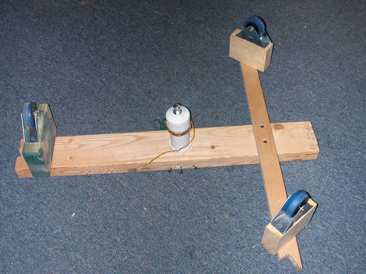 There are three outside wheels. These are cut from 3/8" plywood using a 2" hole saw. The wheels are supported by two brass sleeves that fit inside each other providing a smooth rolling support. The three outside wheels and the center support are held together in proper orientation with two pieces of wood. In this photo you can see the carriage bolt in the middle of the center support that is made of plastic pipe.
