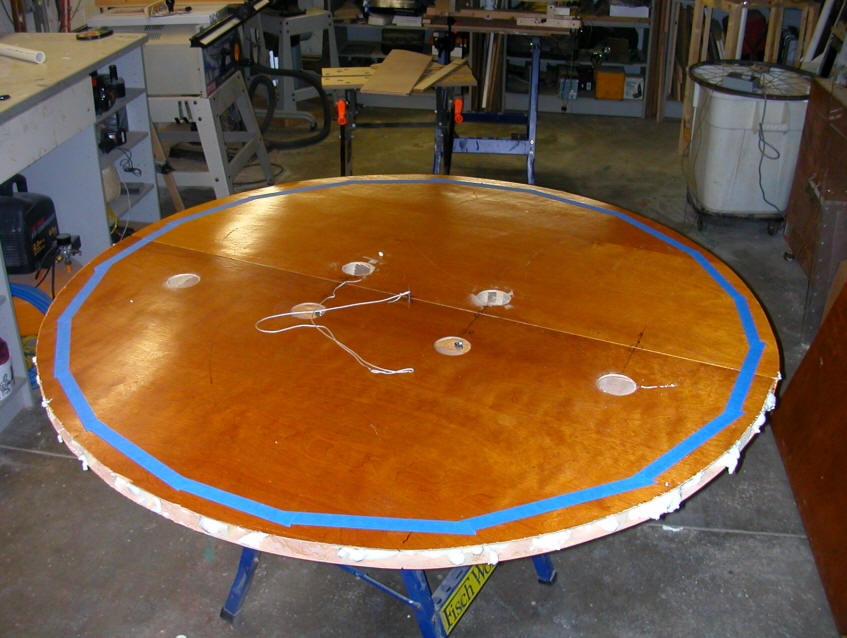 | The Platform: The smallest readily available track size for G scale is LGB 1100 which is advertised as being 4' diameter. Unfortunately it requires more like a 51" circle that cannot be easily cut from a 4 x 8 sheet of plywood. The platform was made from 1/2" plywood. All of the splices and joints that were needed to make a 51" circle were designed to be balanced in weight so that the table would spin evenly. |