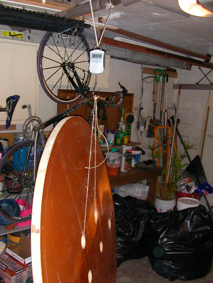 | Bearings - First Try: The first test used an old bicycle wheel (with a genuine Campagnolo hub!). This was screwed to the bottom of the table and mounted to a 2" X 2" board. This worked satisfactorily with the addition of a single support wheel at the edge of the board. See the video for pictures of this setup. |