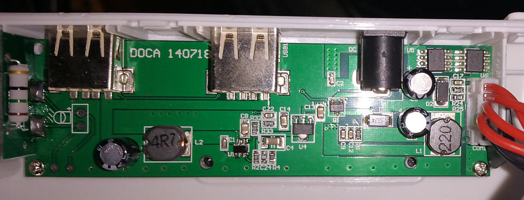 The two USB sockets are at the top (left and center) and the LED is to the far left. You can see its current limiting resistor (25 ohms?)