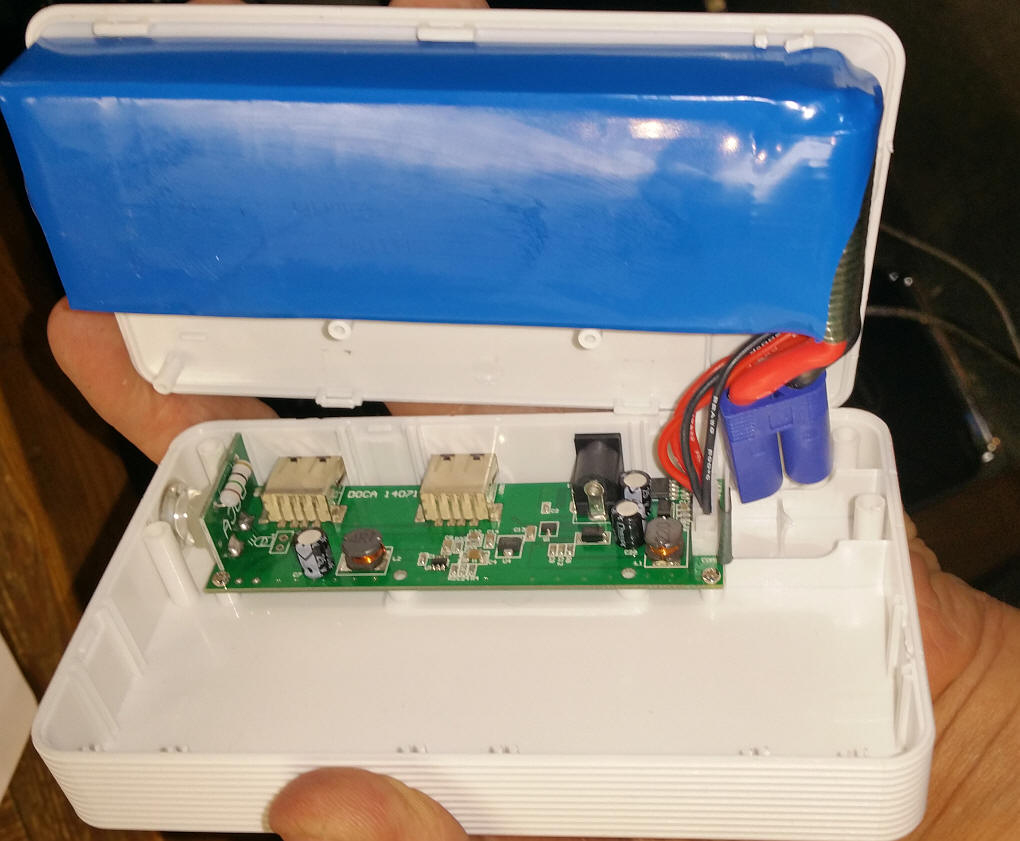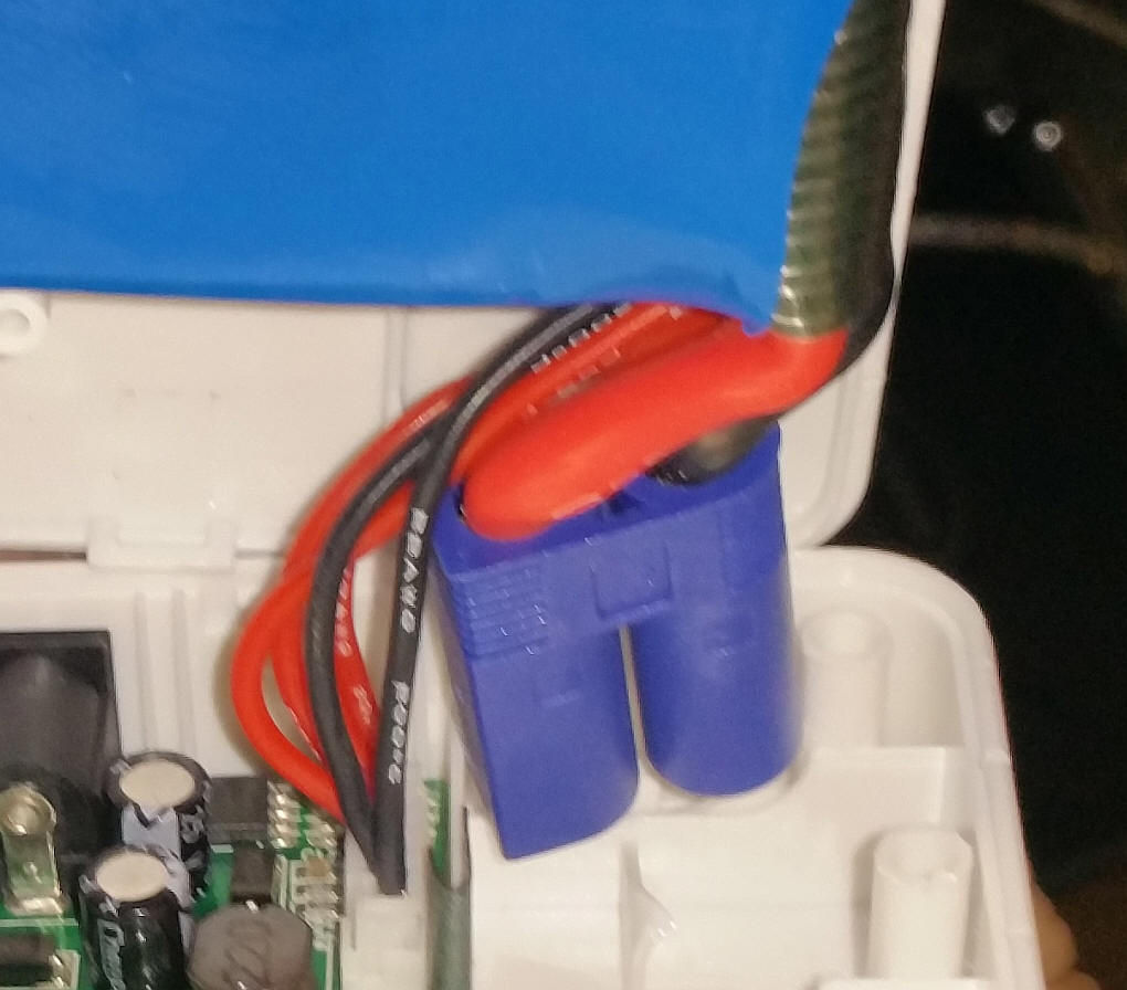 I was curious about how the unit was dealing with the high current it can deliver. I expected some sort of semiconductor between the plugs (above) and the battery. On closer inspection I saw that there is nothing between them! The terminals go right to the battery. This close-up shows the large wires.