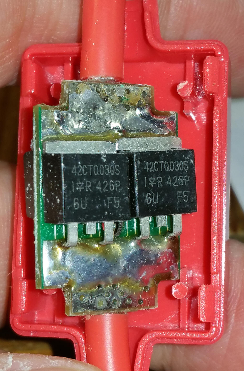 ...but after opening it I found four (there are two more on the other side) low dropout diodes that are used to interrupt current flow should the battery cables be connected to the car battery backwards. Here is the data sheet on the parts that are inside: http://www.irf.com/product-info/datasheets/data/42ctq030.pdf
