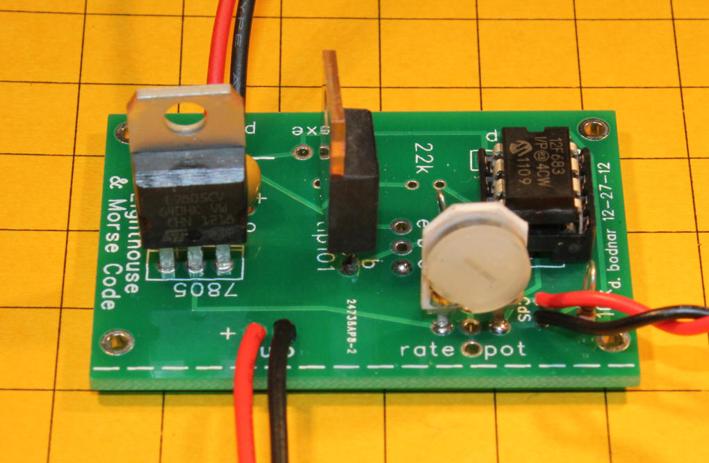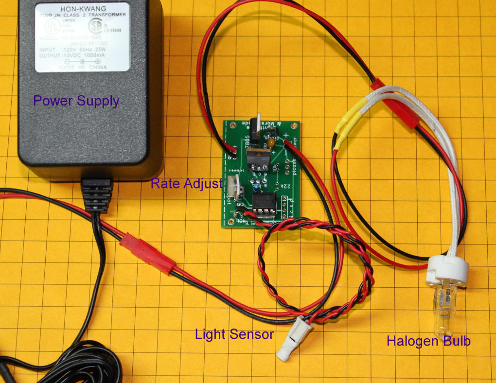 In the photo below the rate adjust pot is in the lower right. Turn it with a small screwdriver. All the way to the left (counter clockwise) gives a 3 second delay. All the way to the right (clockwise) gives a bit over 1 minute between flashes. The wire at the upper left goes to the power supply. The wire in the lower left goes to the bulb and the wire to the right goes to the light sensor.