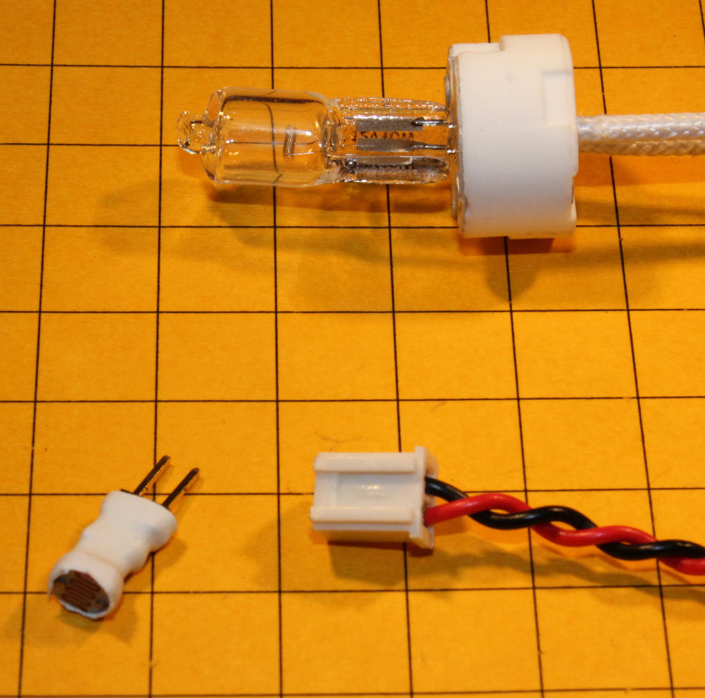 The Halogen bulb is shown in its ceramic socket. The light sensor is at the bottom. If it is plugged into the socket the light will not work until the sensor is dark. If you want the lighthouse to flash during the day just remove the sensor.