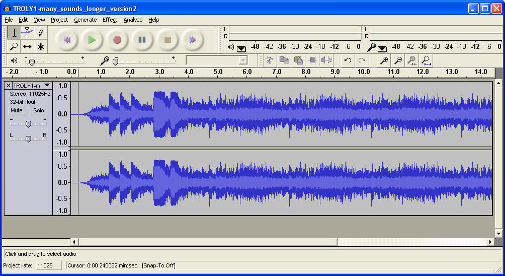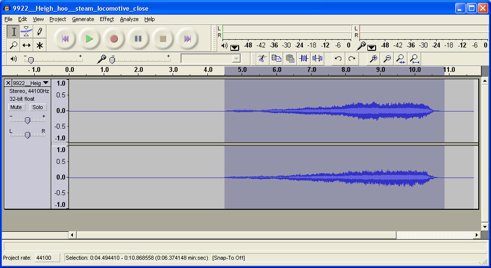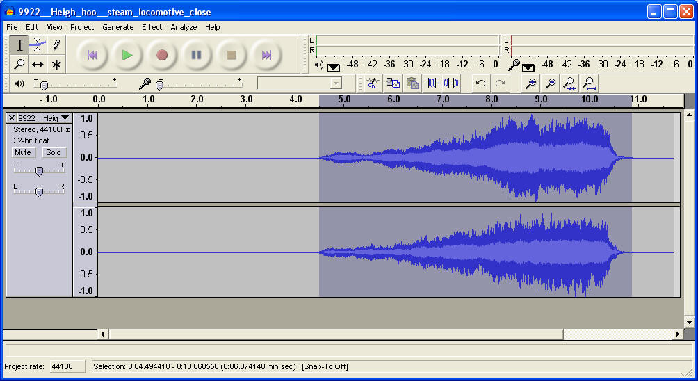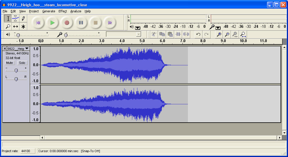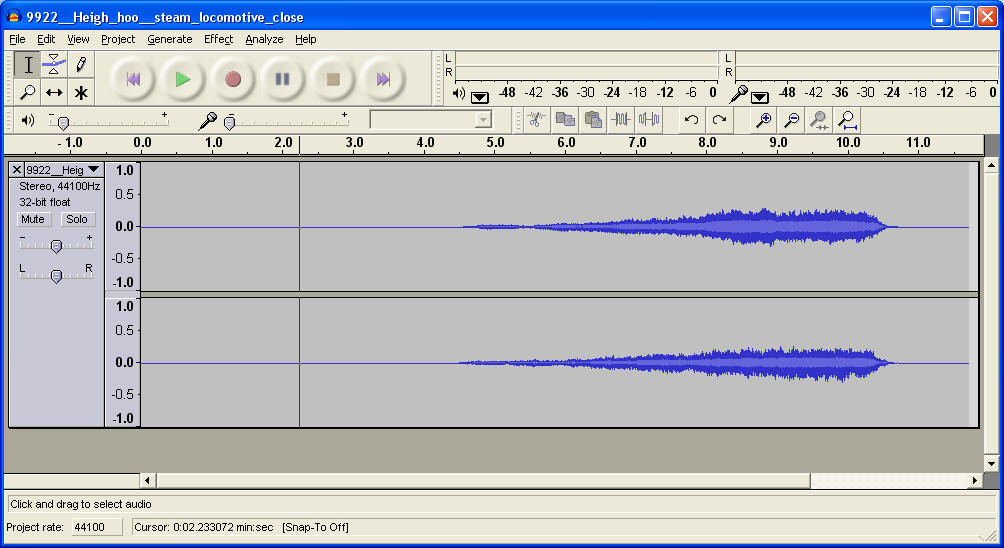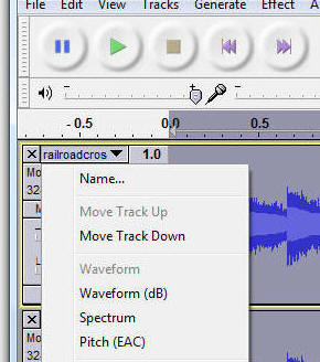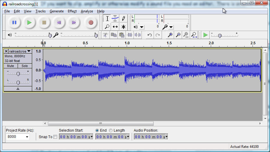 To start the editor click on Start / All Programs / Audacity. Next use File / Open to select a file to edit. Find "railroadcrossing.wav" and load it into the editor. On my computer it looks like this: