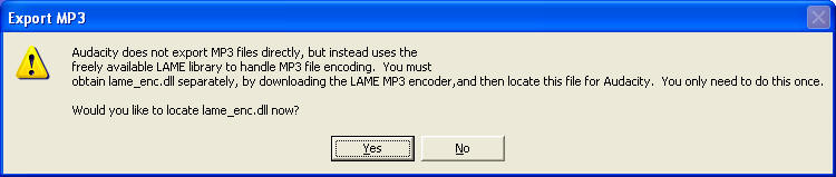 While you are there make sure you also download the Lame MP3 Encoder: http://audacity.sourceforge.net/help/faq?s=install&item=lame-mp3. Audacity cannot export files in MP3 format without this encoder. Download the appropriate file. The PC version is a ZIP (compressed) file. Once it is downloaded double click on the ZIP file to extract the file that is needed: "lame_enc.dll" Copy this file into the same folder that holds the Audacity installation. On a PC it likely to be C:\Program Files\Audacity. When you first try to save an MP3 file you will be asked where the encoder is located. If you put it in the Audacity folder it is easy to find!