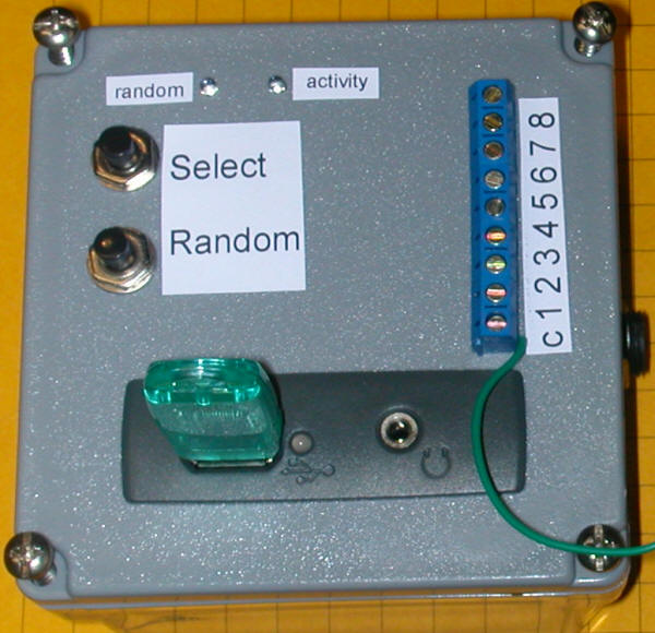 The two buttons in the upper left are for changing the random / non-random setting for each activation switch. The two LEDs at the top, labeled "random" and "activity" help with the programming. The random LED is green when lit and the activity one is blue.