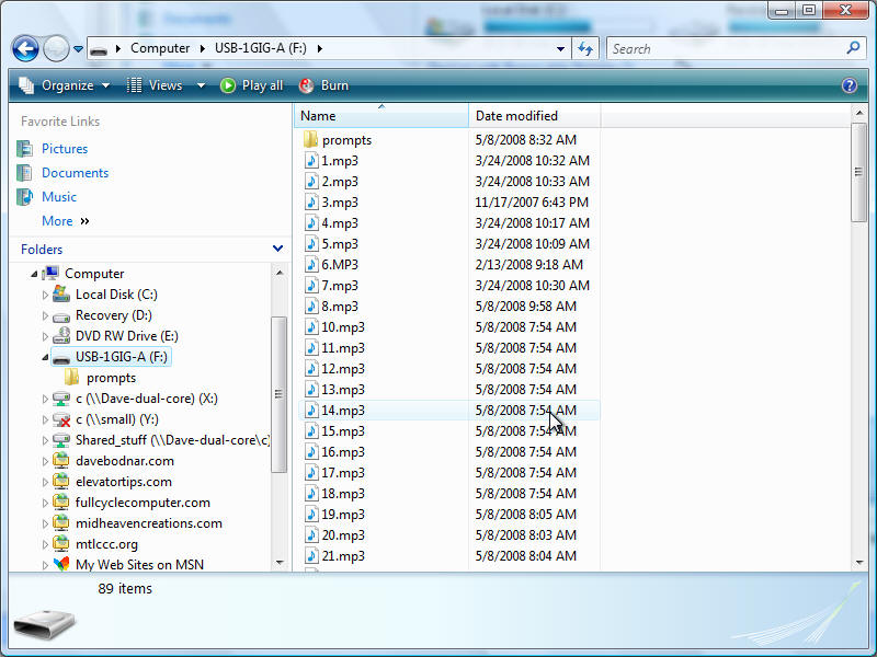 The USB drive contains all of the sound files that the MP3 Sound Controller will use. When you double click on F: (or G:) you see a partial list of files like the one below. Scroll down the right hand panel to see the whole list.