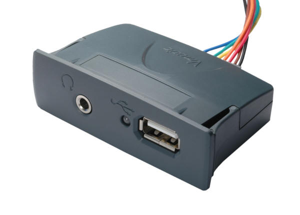 The prototype MP3 Sound Controller is shown here. The plug that goes to a set of amplified computer speakers is plugged into the VMUSIC2 module at the bottom. To its left is the USB memory stick. There is a small LED between the speaker plug and the memory stick. It is red while it is initializing and green when the unit is ready. Do not press any of the activation buttons while this LED is red.