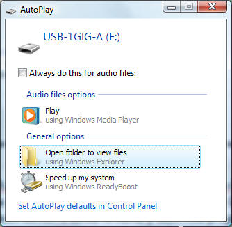 You should see a window something like the one below - this one is from Windows Vista. The USB memory stick is drive F: