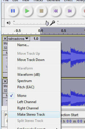 If you have a stereo sound file it will play through both speakers. Audacity can easily take that stereo file and change it into a file that will only play from one or the other of the stereo speakers. You might want to do this if you have the two speakers in two different buildings. Perhaps one in the saloon and the other is at the train station. You could have all of the dancing / partying sounds coming from the saloon speaker and the train arrival / departure sounds coming from the other speaker.