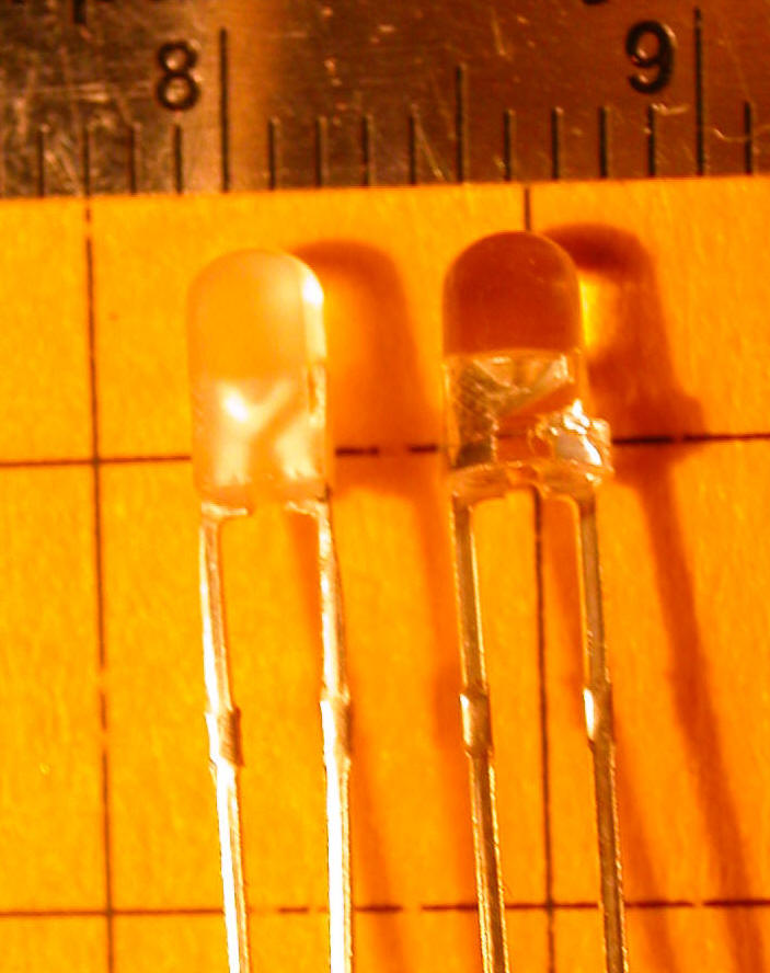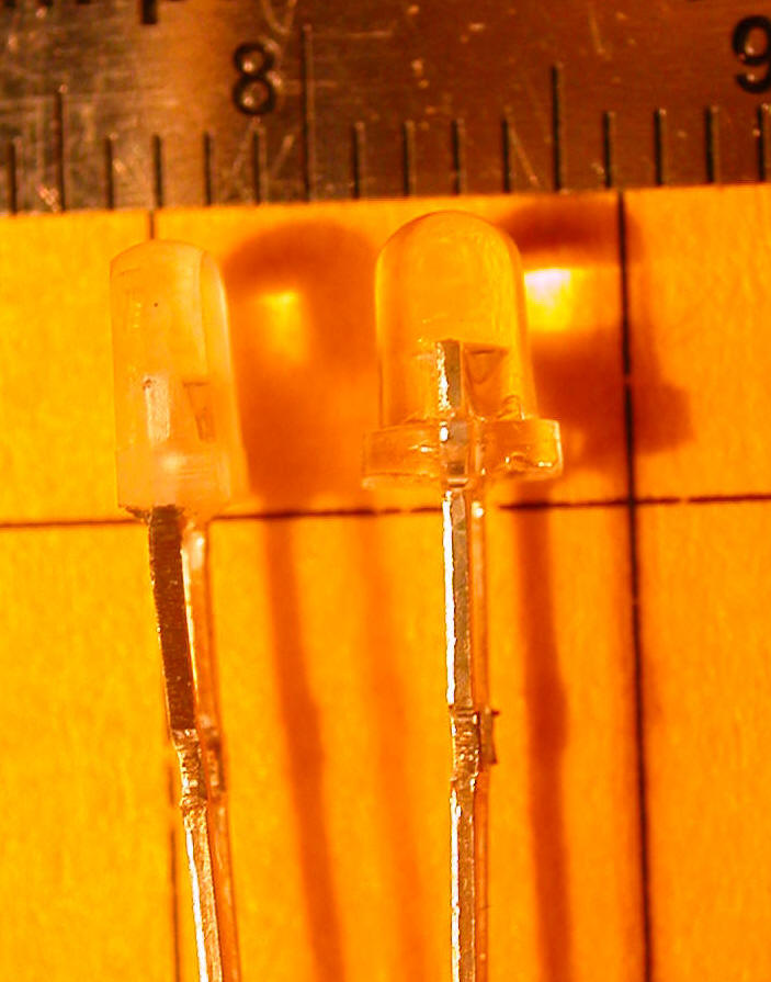 In this photo 7 unmodified 3 mm LEDs are in the lower left. In the upper right are the same 7 LEDs but after they have been ground down with an abrasive wheel on a Dremel. The dimension from left to right has not been reduced much but the dimension from top to bottom is much smaller. It is possible to remove too much material and destroy the LED. Test the LEDs often during grinding or grind them with power applied (through a current limiting resistor) so that you can learn when they fail!