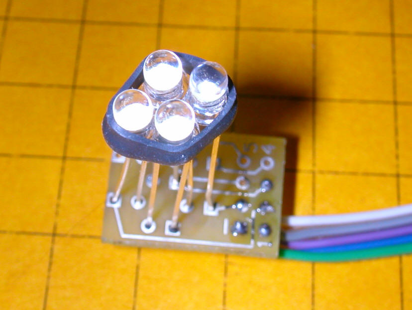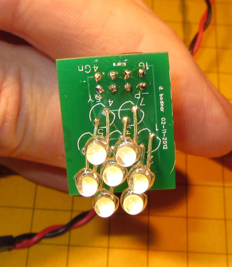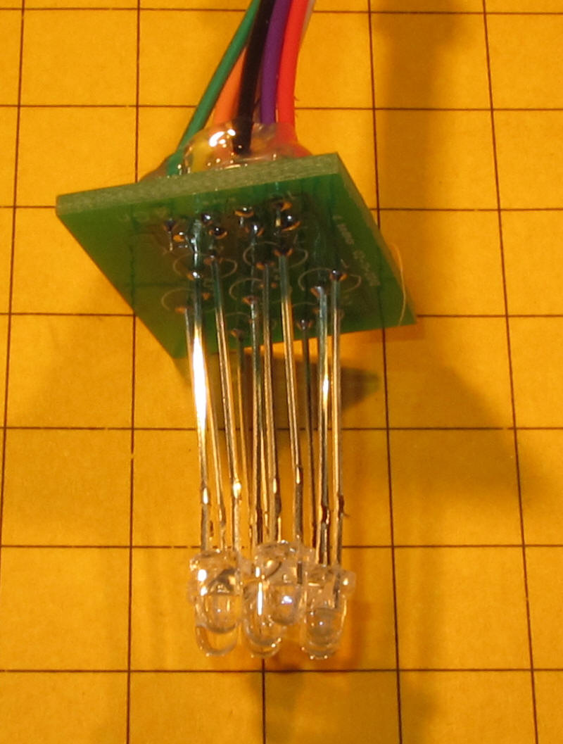 As you can see from the photo above the array of seven 3 mm LEDs takes up a good bit of space, even when aligned in the most compact pattern. Although there is plenty of room in a number of diesel locomotives for this array I experimented with ways to make the 7 LED array even more compact.