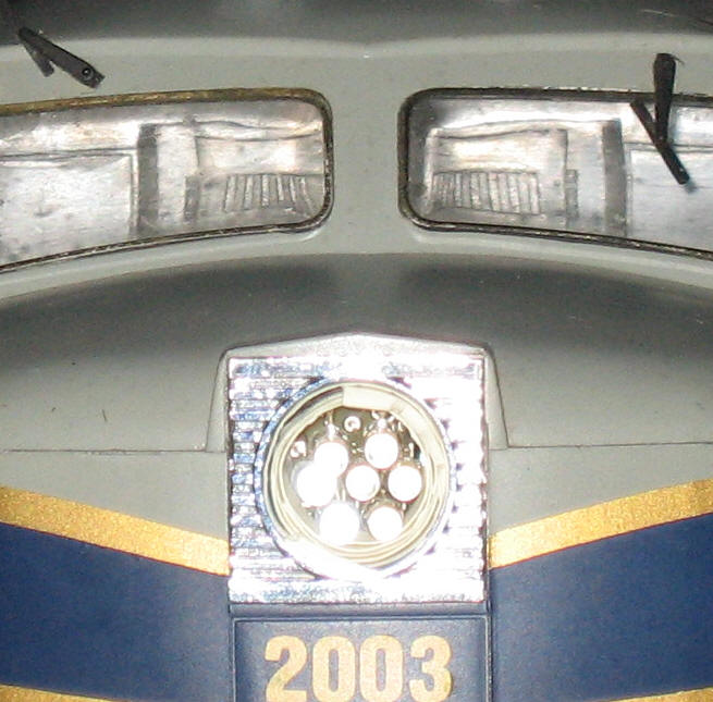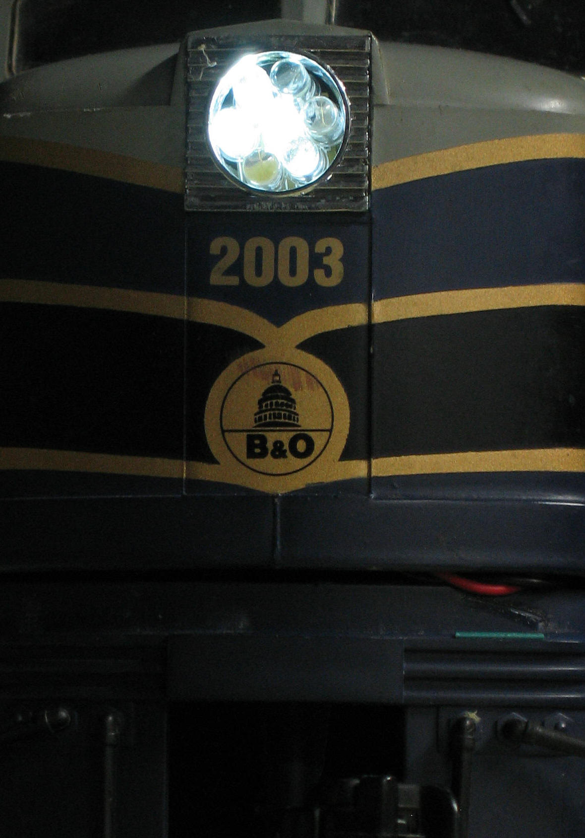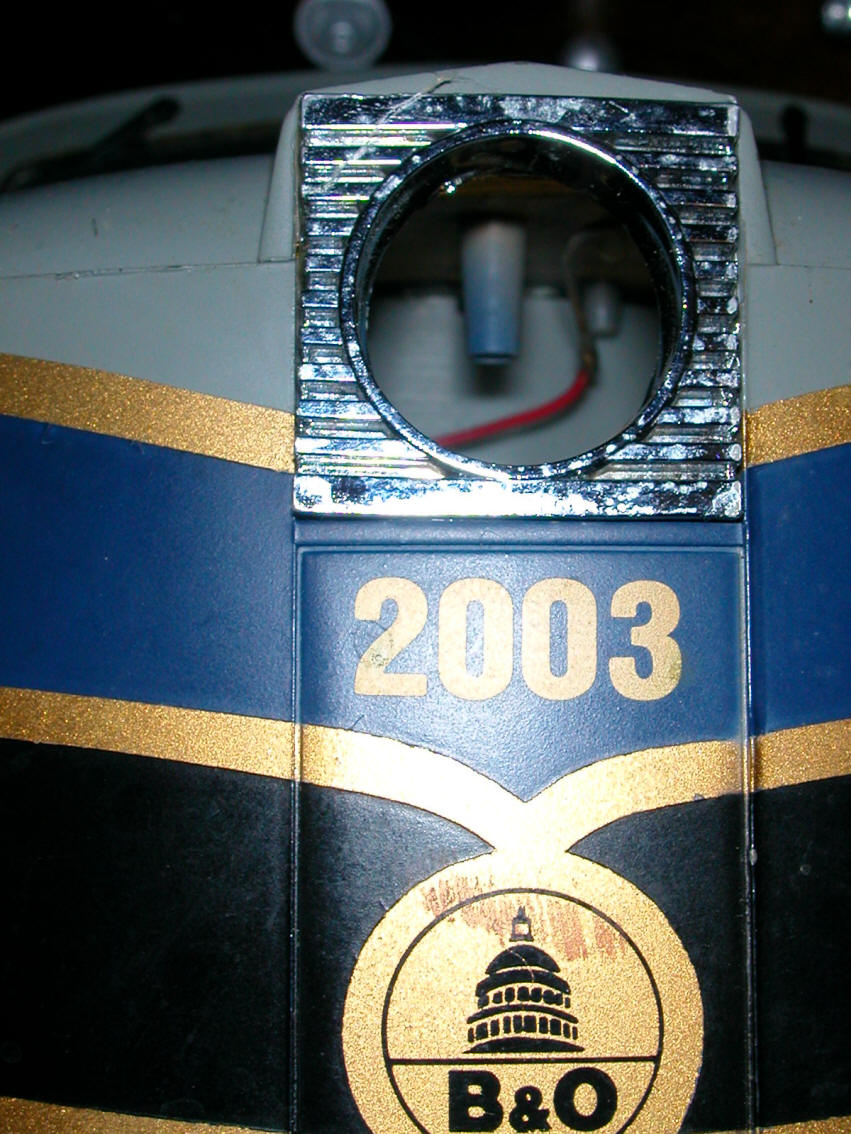 Once I had a working prototype of the circuit and the software was completed I looked around for a diesel engine that I might use for a test installation. The only diesel engine in my collection that might have used Mars lights is an AristoCraft FA1. I removed the factory installed headlight and found that the remaining hole was well over the size that I needed to install a set of seven 3 mm LEDs.
