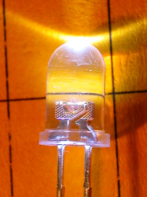 Here a 5 mm LED is connected to power. You can see light emitting from the top of the LED's lens as well as a bright spot in the center of the reflector deep within the LED. You can also see that there more plastic to the left and right that might be removed.