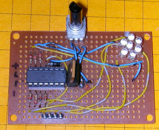 The first prototype circuit board is shown below. The microcontroller is the object just left of center. To its right is a 7805 voltage regulator that provides a consistent 5 volts to the system. The speed control potentiometer is at top center and the array of 7 LEDs is in the upper right corner. Note that there are 7 small resistors around the microcontroller. As you may have guessed they limit the amount of current going to each of the LEDs.