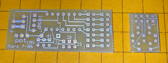 The finished boards are shown below. The main board is to the left. The smaller board is for the LEDs themselves. I decided to use two separate boards so that the LEDs might fit into the limited space available in the front of engines. For the 7 LED system an 8 conductor wire is used to connect the two boards. The 4 LED unit only requires 5 conductors in the connecting cable. The cable can be as short as an inch or two and as long as several feet.