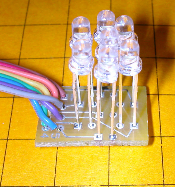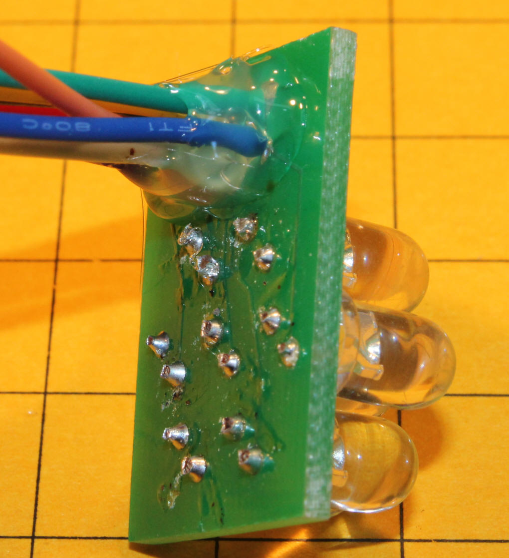 This side view shows how the LEDs can be mounted a short distance "off" of the board. Leaving the leads like this will allow you to experiment with directing the light from various LEDs to the sides, top and bottom. One does, however, need to take care not to allow adjoining bare wires to touch!