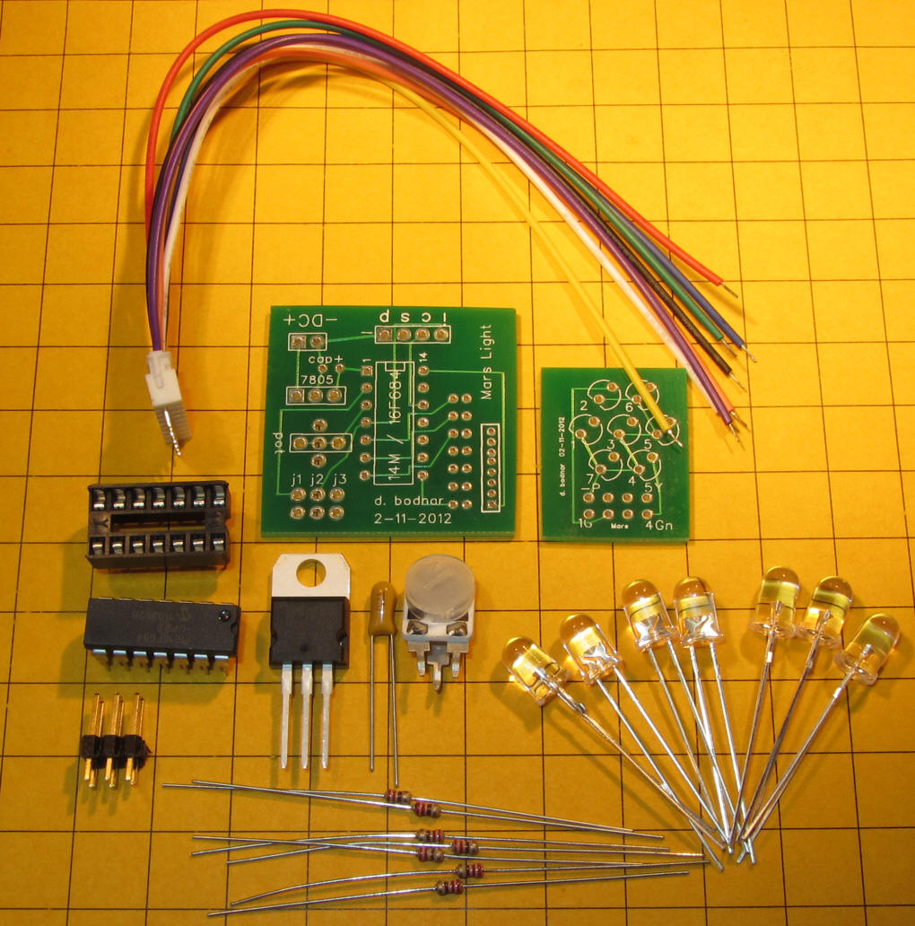 Complete kit of parts (both boards, programmed PIC, voltage regulator, 7 white LEDs (3 mm or 5 mm), resistors, jumpers, etc - the only thing you add is power and hook up wire to connect the two boards) - $26.00