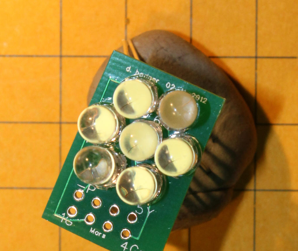 Rather than adding LEDs one or two at a time I decided to make the jump from the two LEDs used in the first experiment to an array of 7 LEDs that I felt had the potential to give a more accurate Mars light display. The 7 LEDs were arranged so that there were three in a horizontal row with two centered above and two centered below. Since the size of the complete light was sure to be an issue it was fortunate that this turns out to be the most compact way to arrange this number of round LEDs. I also opted to begin my experiments with 3 mm LEDs as they are the smallest bright, white LEDs that are readily available and are fairly easy to work with.