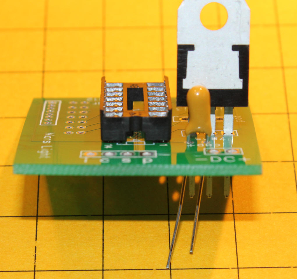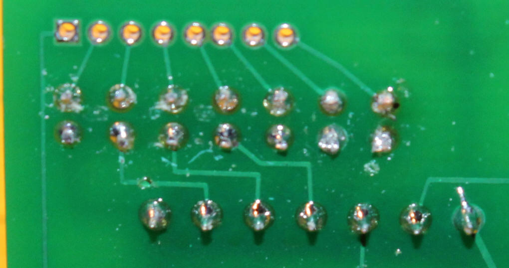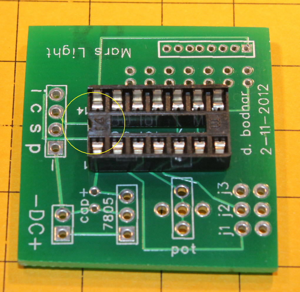 The thin wires are quite fragile. Adding a bead of hot melt glue around them will prevent them from breaking away from the board. Insert the 14 pin socket into the main board with the notch oriented as shown (note the yellow circle). Solder from the back.
