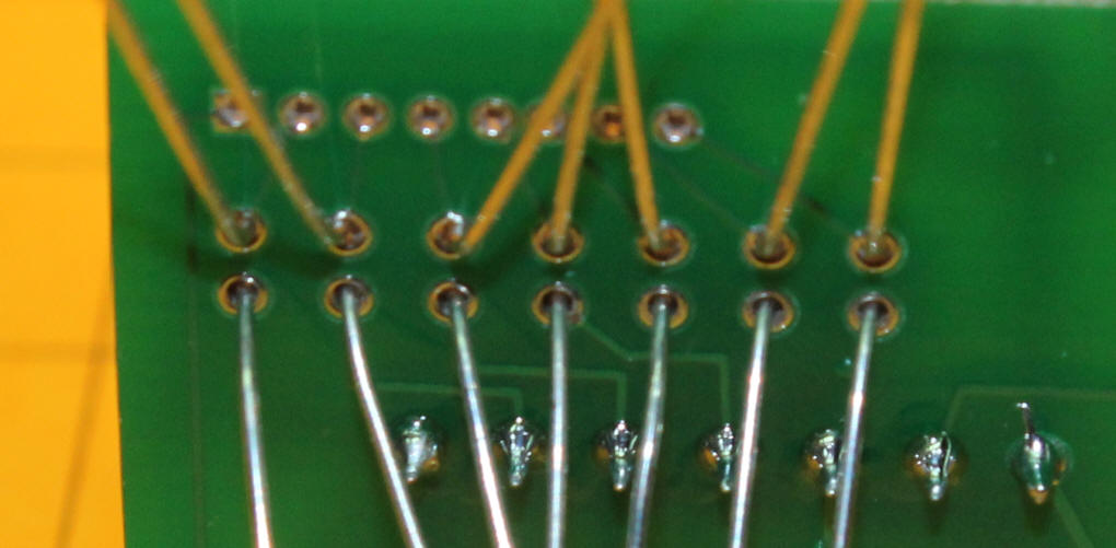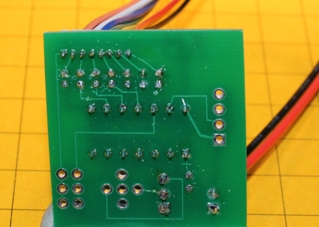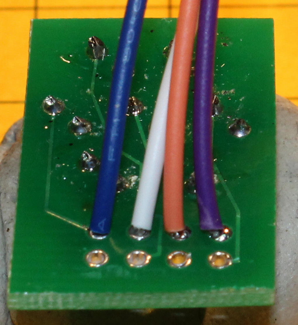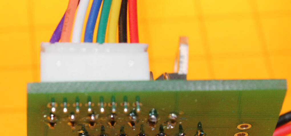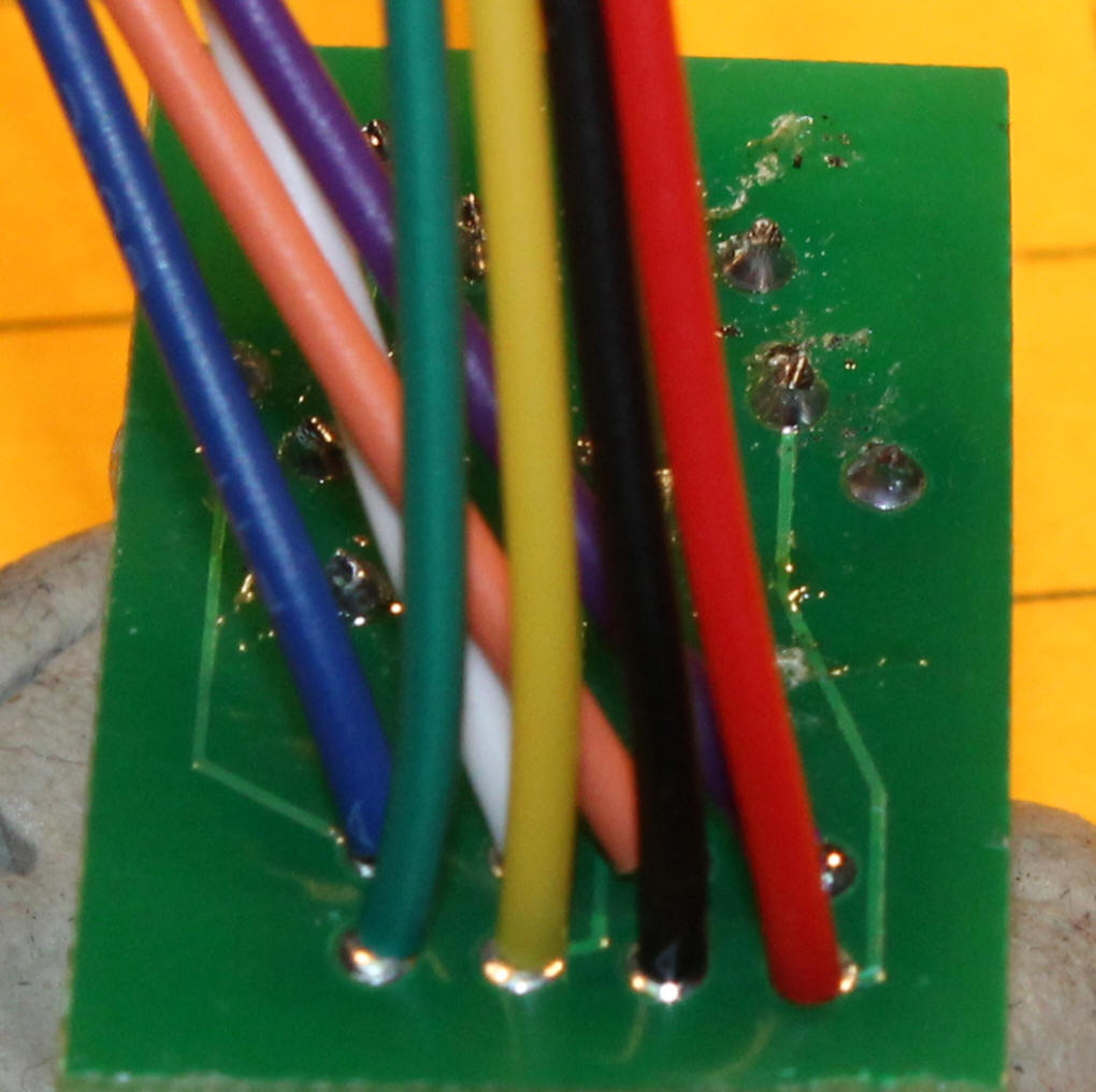 The wiring harness for the LED board is soldered as shown here. Solder the purple, white, orange and blue wires first. Make sure that they go into the holes as in the photo. REMEMBER: your cable is likely to have a brown wire where this photo shows purple! Next solder the green, yellow, black and red wires.