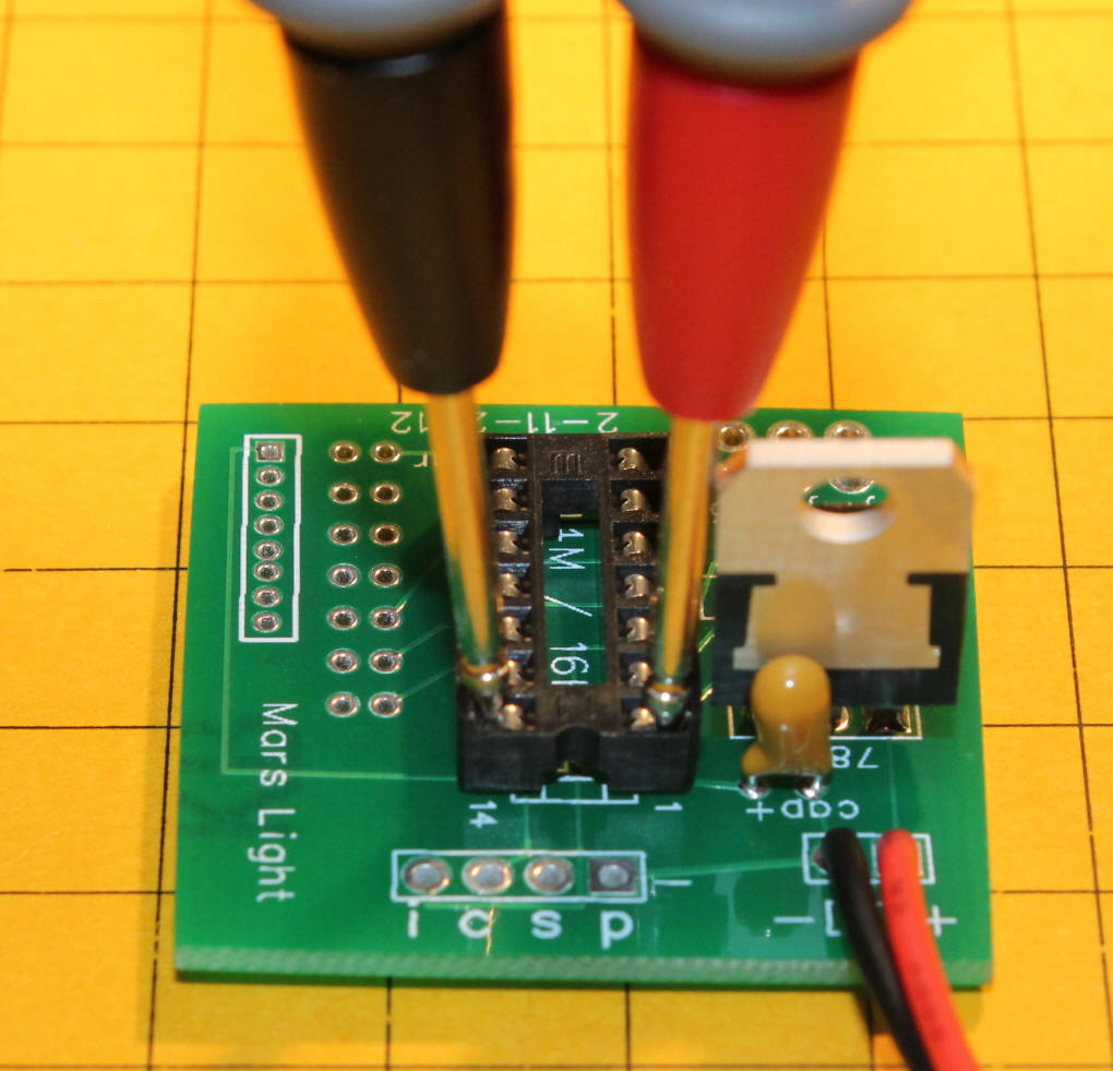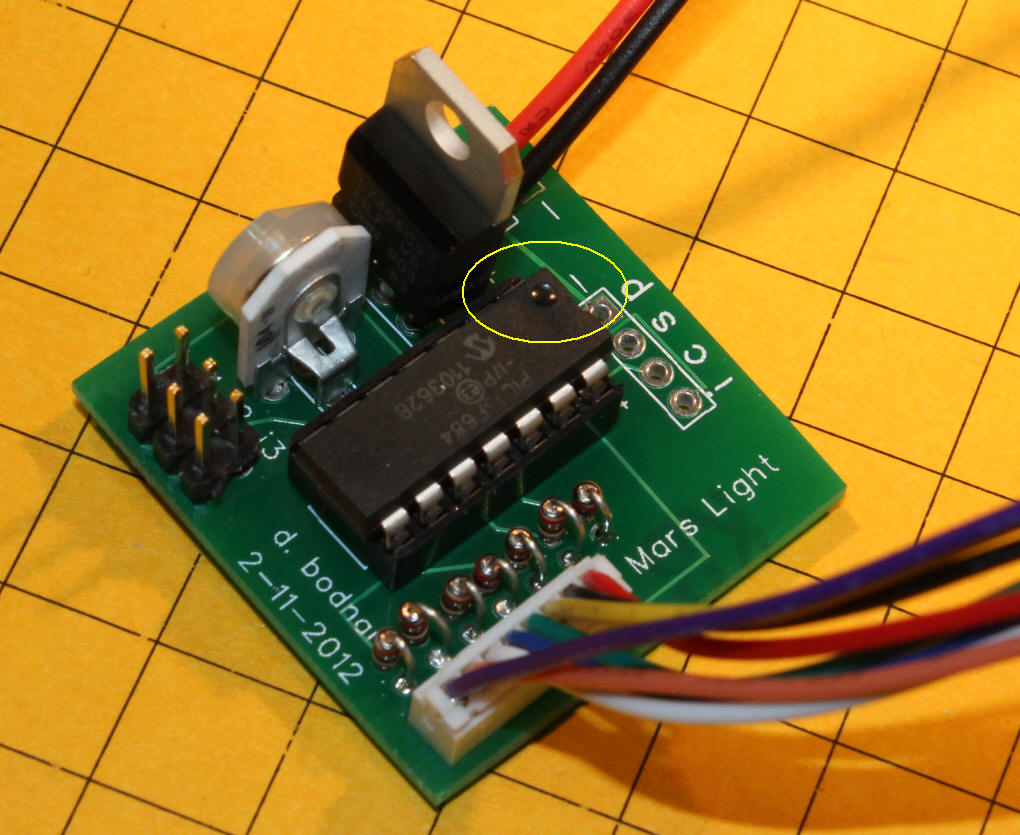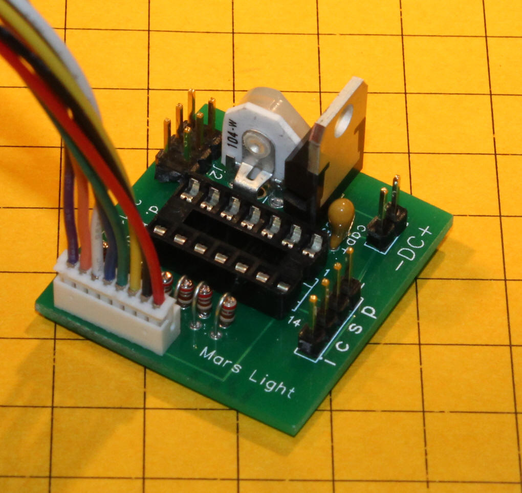 Based on the number of folks who had expressed an interest in the Mars lights I decided to design a custom circuit board and have them produced before I wrote up this article. While working on a design I added a few features that I thought would make the boards more useful. First, I designed the board and chose a microcontroller chip that would support either 4 or 7 LED arrays. This would allow the same board to be used for both designs. After assigning 7 pins, one for each LED, and an 8th pin for the speed control pot I still had three pins that were unused.