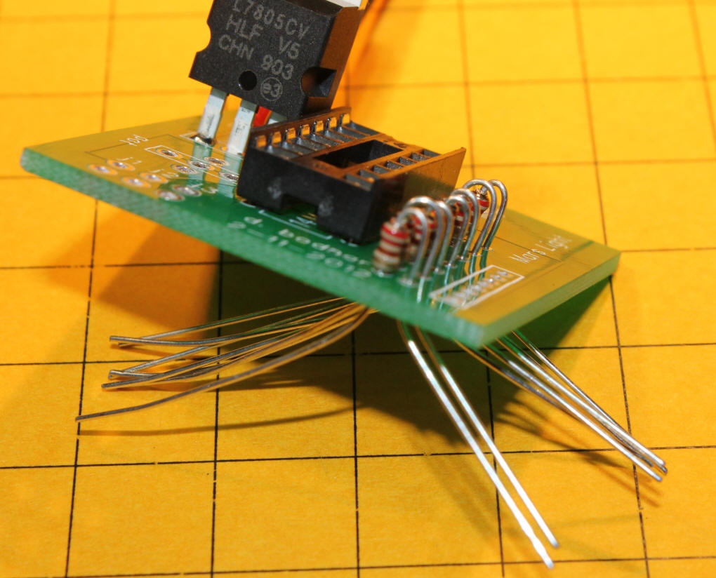 Insert the 7805 regulator and tantalum capacitor as shown. The label on the capacitor faces the 7805. The longer lead on the cap is to the left. After soldering the regulator and capacitor and trimming their leads apply power to the + and - terminals and test pins 1 and 14 with a volt meter. The meter should show 5 volts, plus or minus a 1/10 volt. Insert the seven 220 ohm resistors and bend their leads as show to facilitate soldering. The leads are close together. Bending them makes soldering easier. After soldering trim the leads and make sure there are no solder bridges between connections.