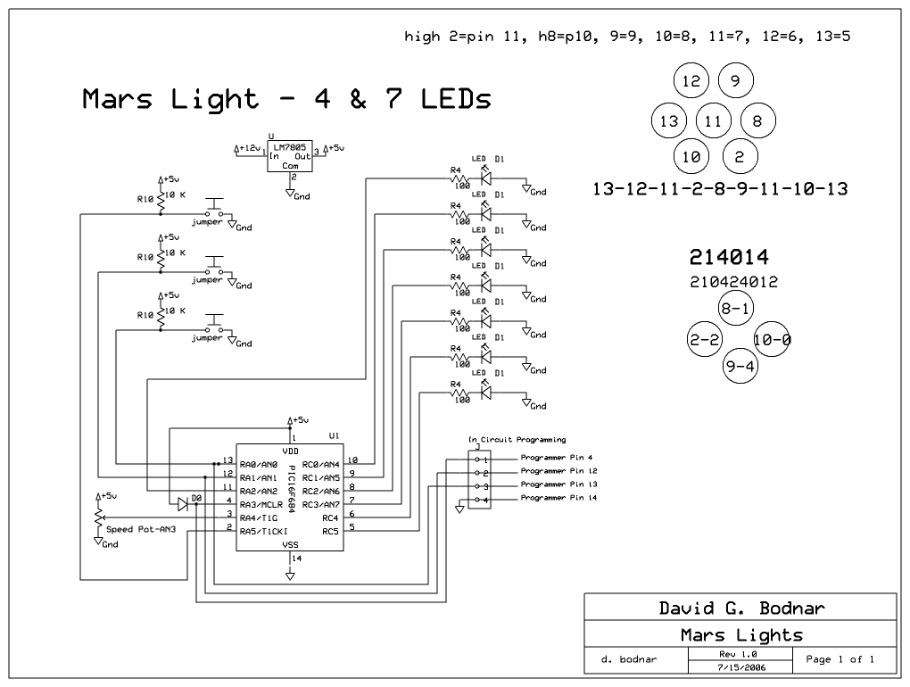 This circuit utilizes a microprocessor to simulate the unusual behavior of Mars lights that were installed on some railroads' engines several decades ago. To make engines more visible the Mars light would rotate in a horizontal "8" pattern shining left, then center, then right and repeating. |