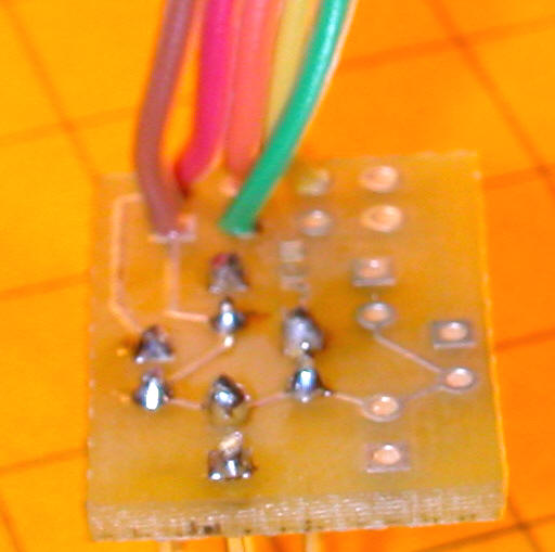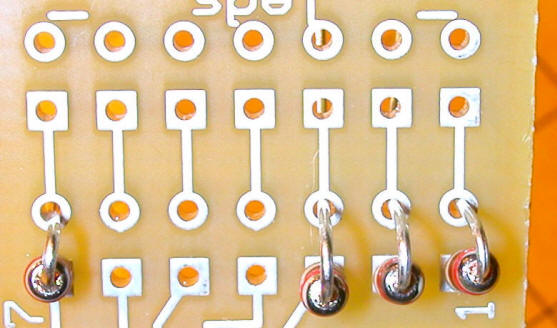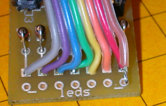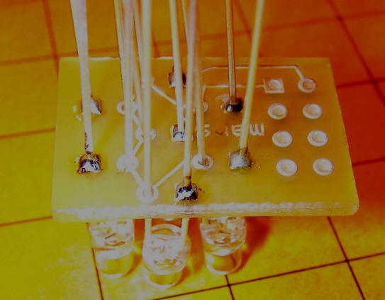 insulation taken from other wire. If you are working with the 3 mm LEDs there is a small protrusion on the leads that will stop them all about 1/4" from the board. This is what is shown in the example photos. |