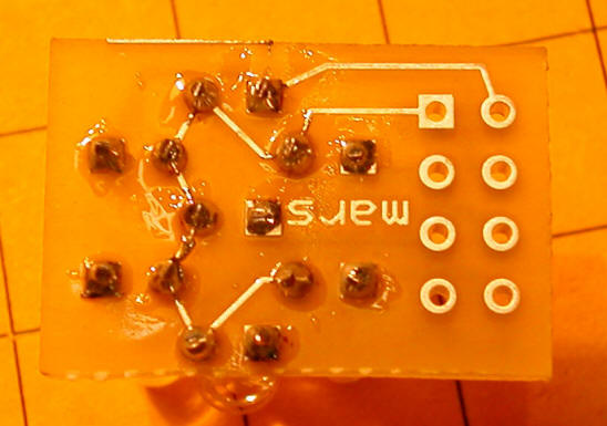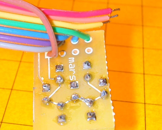 Note that the wire can be inserted from the front or the back of the board. I find it best to have it going in from the back of the board (the side with "mars" written on it). That way the wire is less likely to interfere with the installation of the LEDs. |