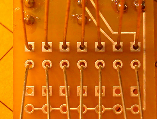 1. The 7 LEDs go into the 7 pairs of holes on the LED board. Note that each pair of holes has a round and a square solder pad. The longer (positive) LED lead goes into the square pad and the shorter (negative) lead goes into the round pad.. The 8 holes at the edge of the board are for the connecting wires that go to the main circuit board. They are numbered 1 x x 4 on the edge and - x x 5 on the 2nd row (x = no label) |