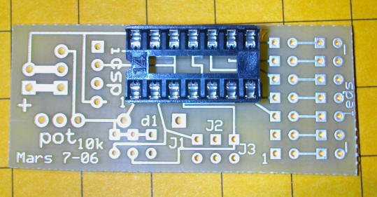 1. After making sure that everything is soldered correctly insert the microcontroller into its socket. You must insert the chip with the proper orientation. Note that pin "1" is marked on the top and bottom of the circuit board. There is a small dot on the microcontroller next to pin 1. Align the chip so that pin 1 lines up with pin 1 on the socket. |