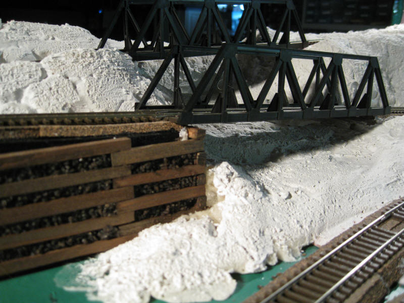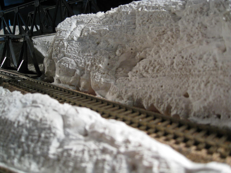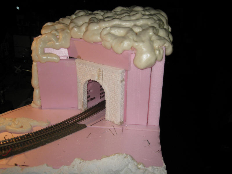 The mountains were given additional mass with spray foam (Great Stuff). It works very well but one must be careful not to put TOO much under anything as can be seen in these two photos. Note that the ballast and track have heaved! Fortunately this area was destined to be a valley crossed by two bridges so no real damage was done.
