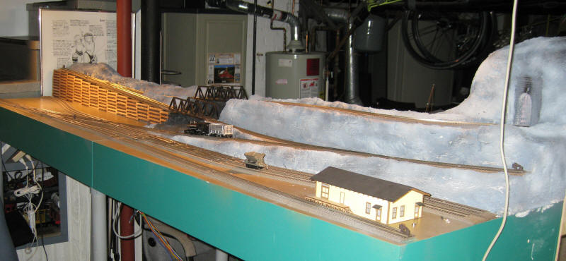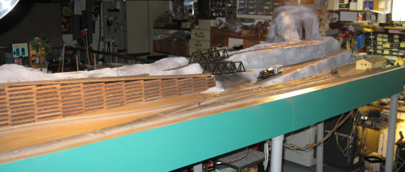 This view shows the main line and the tunnel portal that will be on a small add-on section. You can also see the double-slip-switch that will be used to switch between the passing siding, the main line and the work line. All of the track, the crossover and all switches are code 83.