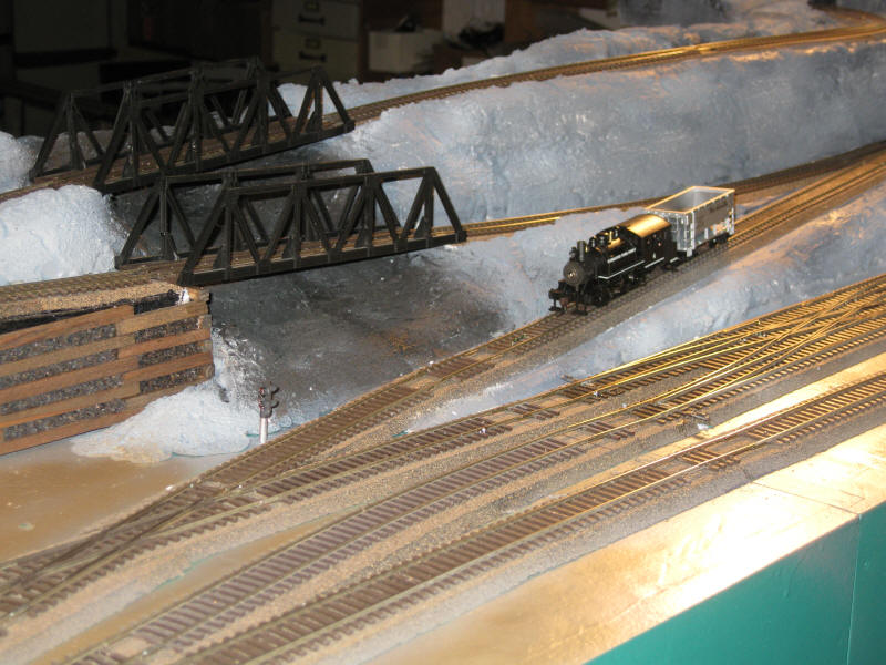The Plan The module is made up of two four foot sections. It is designed to have a main line in its center and a self-contained working line that including a number of switch backs that take the train up a mountain. In addition 1/2 of a passing siding is next to the main line. This will connect to Paul Hanson's module that has a matching section. This photo shows the two modules joined together. The switchbacks rise on many foam sections. Note that each of the switches is not level. They all maintain the grade of the longer rail line. This forces the train to go down a bit before it begins to rise to the next switch.