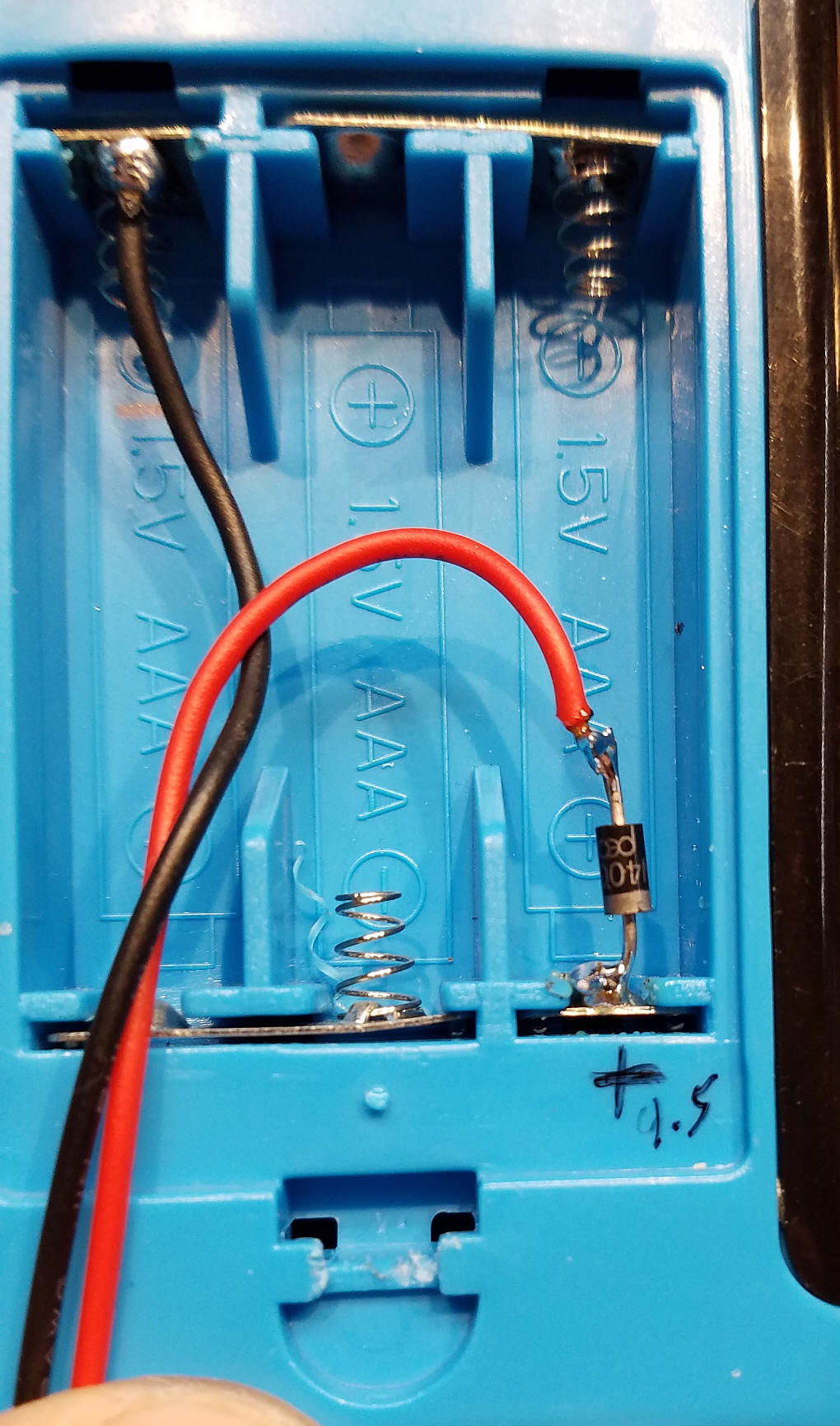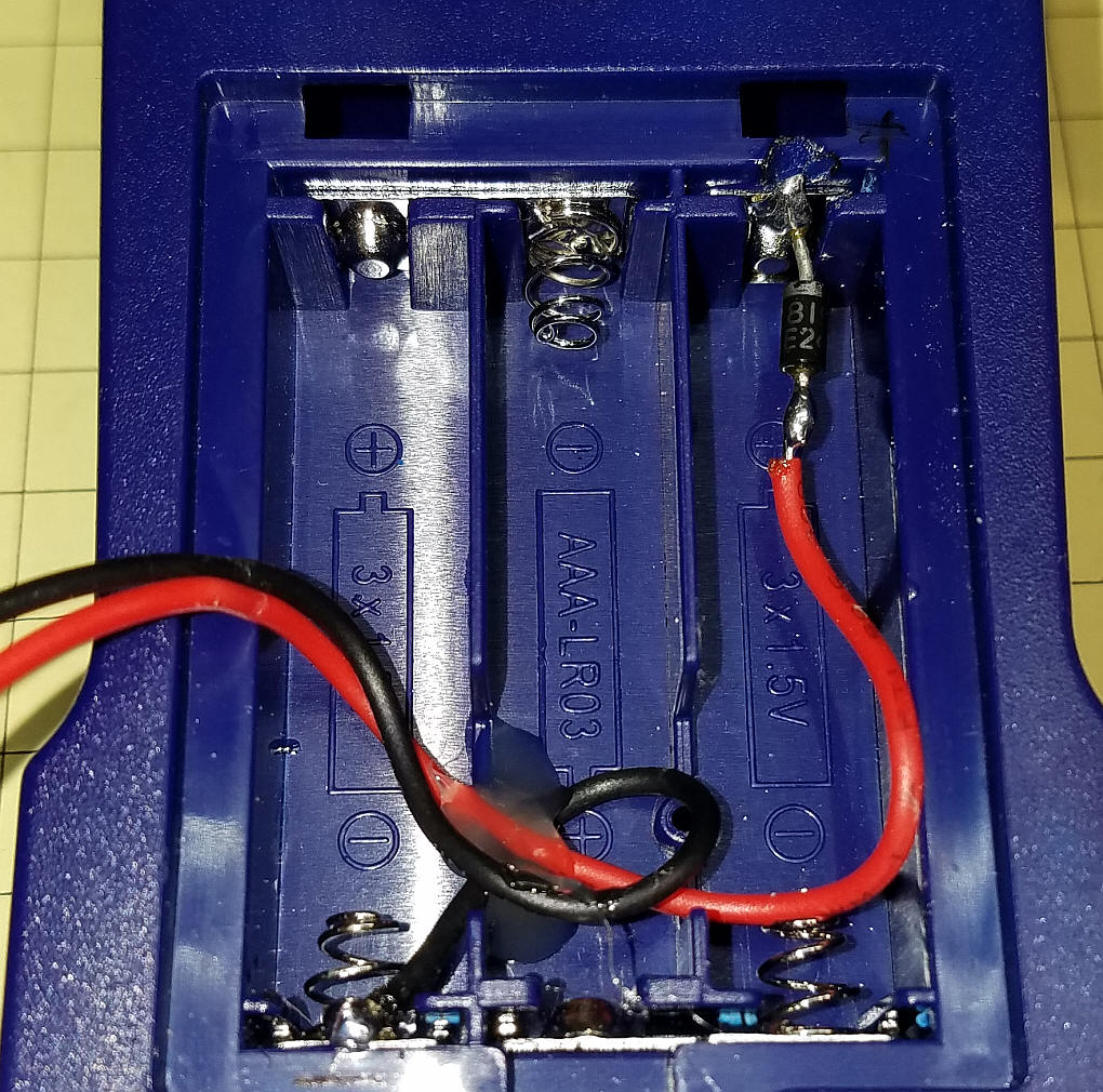 Modification To operate trains that are normally run with a remote control a few things need to be done. First the hand-held transmitter needs to be modified to operate from a plug-in power supply rather than 3 AAA cells. Three AAA cells provide 4.5 volts DC to the transmitter. The same voltage can be supplied by a common cell phone charger that provides 5 volts DC. Adding a single silicon diode in series with the positive lead drops the voltage from 5 volts to about the same 4.5 volts that is supplied by the batteries. This photo shows the transmitter for a LionChief loco. A black wire has been soldered to the negative battery terminal. Note that this is one of two terminals that are NOT joined to the adjoining battery by a piece of metal. This connection can be clearly seen in the top right area of the battery box and again in the bottom left. The positive red wire is soldered to the positive terminal through a 1N4001 diode. Note the orientation of the band on the diode. This photo is of a LionChief Plus transmitter's battery box. Note that the positive terminal is at the top in this unit. The red wire is connected to the positive terminal of a cell phone charger and the black wire goes to the negative. If these are accidentally reversed the diode will not conduct, protecting the transmitter from damage. Once the modification is made all transmitters are set to an appropriate speed and left powered on. |