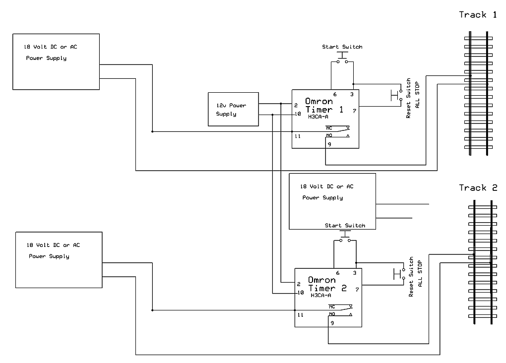 Modification To start a train power is supplied to the track. To stop it track power is removed. This is done by wireing a simple circuit using an Omron H3CA timer. This device is a digital timer that can be configured to activate a relay for a set time (40 seconds in the photo here) when a button is pressed. When the time expires the relay opens.