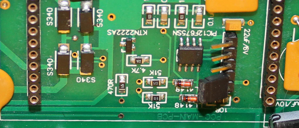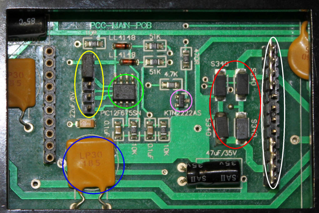 The circuit board that resides under a cover on the bottom of the trolley is shown here. A number of components are highlighted: