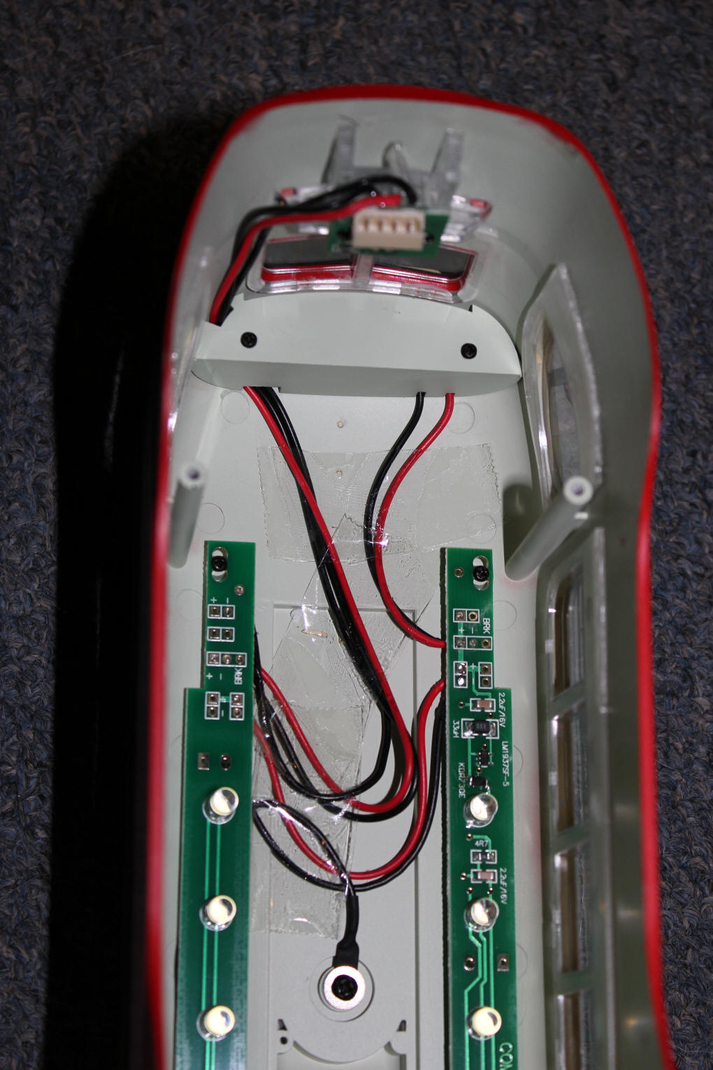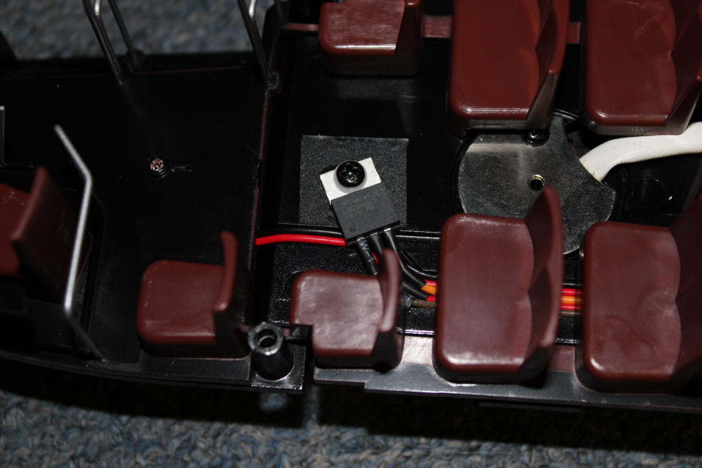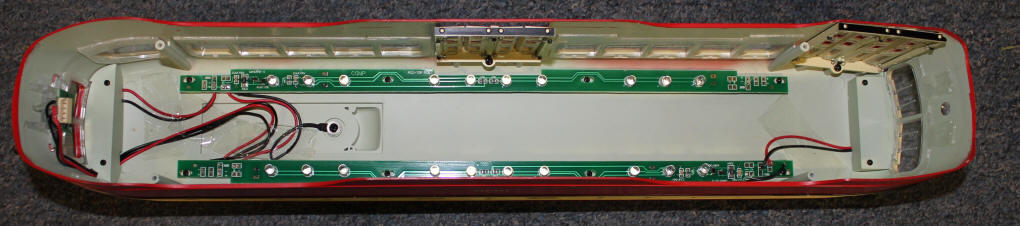 ... and here the body plug can be seen at the top of the photo. You can also see the wiring to the power pole (black wire at bottom center) and a few of the 20 LEDs that illuminate the interior.