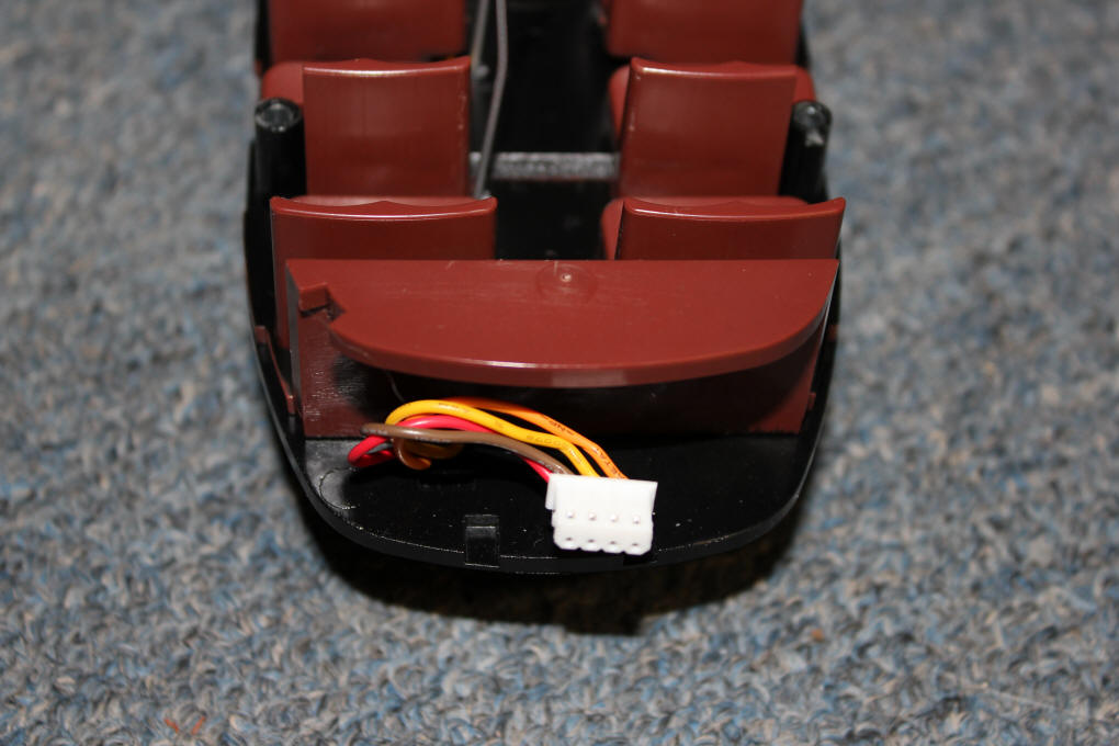 The top comes off after removing four screws. A four position plug allows for easy separation of the top and the bottom of the trolley. Here you can see the chassis plug.