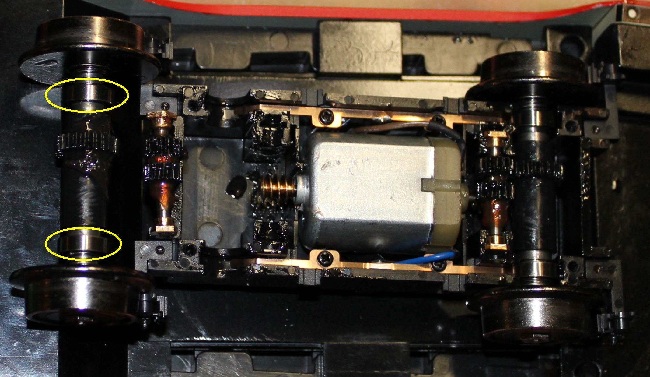 There are ball bearings at each end of the main axles (circled in yellow) - also note that the main axle and intermediate axle have been removed in this photo.
