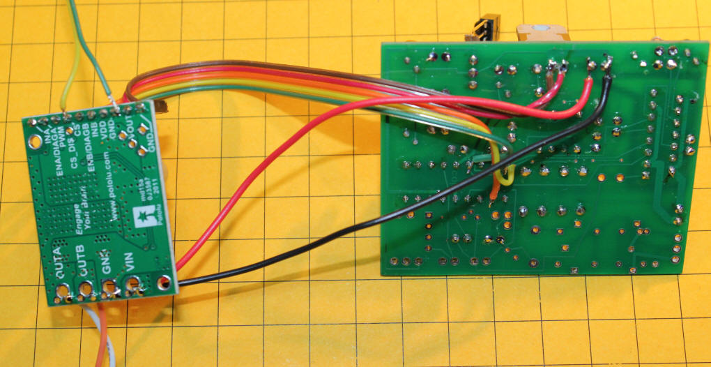 Introduction While the original PICAXE based model train controller works very well and can operate most model trains, including fairly large G-Scale locomotives pulling as much as 3 amps, there may be hobbyists who need "more power!" In response to this need I have found an external H-Bridge that can be used with the original unit to provide 12 continuous amps of power with surges up to 30 amps! The modification to the circuit is very simple and it is not even necessary to make any changes to the controller or software. Not only will the external H-Bridge work with both versions of the circuit (the TV Remote Control version and the Train Recorder Version), you don't even need to remove the original L298N H-Bridge. All that is needed is a few wires that go between the PICAXE controller and the H-Bridge circuit board. The Pololu