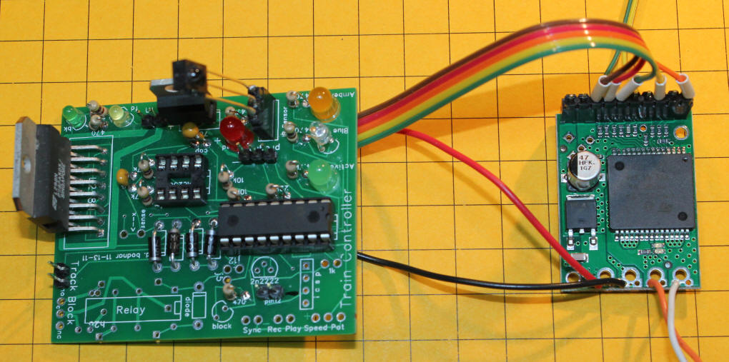 Wiring the Circuit Start by building the circuit as described here: http://www.trainelectronics.com/PicaxeSpeedController/article . It is not necessary to install the L298N power IC unless you want to have both power options available. Five wires need to be connected between the left side of the H-Bridge board and the PICAXE board. In addition the two boards need to share a common ground so power for the both boards must come from the same source. Connect wires to the following pins on the H-Bridge board: INA, PWM, INB, VDD and GND