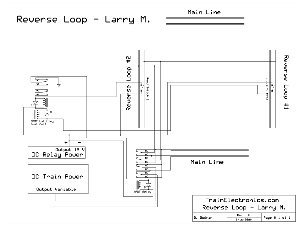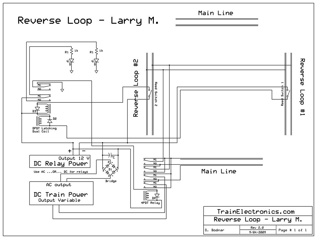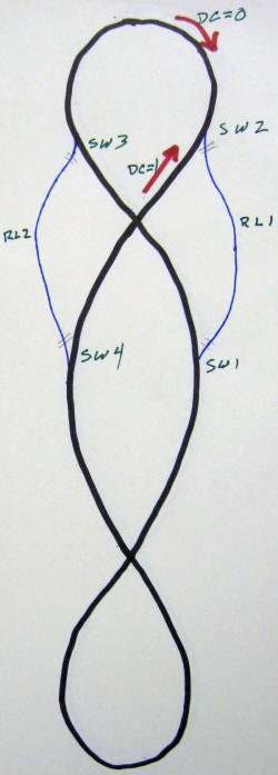 Overview: A reversing loop is frequently used by model railroaders to reverse an engine's path on a single main line. The problem with reversing loops crops up when track power is used as they create a short circuit within the track as the loop connects the two rails of the main line. This problem is addressed in a number of ways. The simplest and most common is to completely isolate a section of the reversing loop from the main line. This isolated section must be long enough to accommodate the engine and any cars that might have pickup wheels that feed power to the engine. The isolated section is powered from the main line through a bridge rectifier. This device supplies the same polarity of power regardless of the polarity that is fed into it. When the train has fully entered the reversing loop a reed switch is tripped by a magnet under the engine triggering the controller which throws the DPDT relay reversing the power to the main line so that the train moves in the proper direction upon exiting the reversing loop. An optical sensor can be used in place of the reed relay and magnet with additional circuitry. Unfortunately this option will not work in this case as the train can go into the reverse loop in either direction. The following information will help in designing a solution to this problem. |
