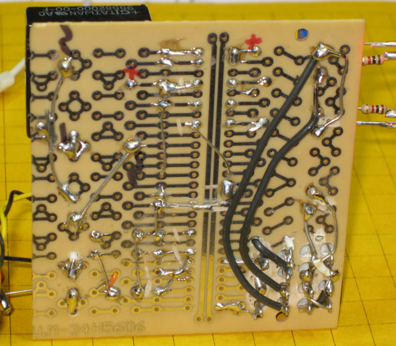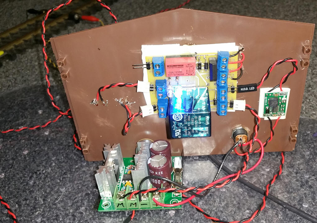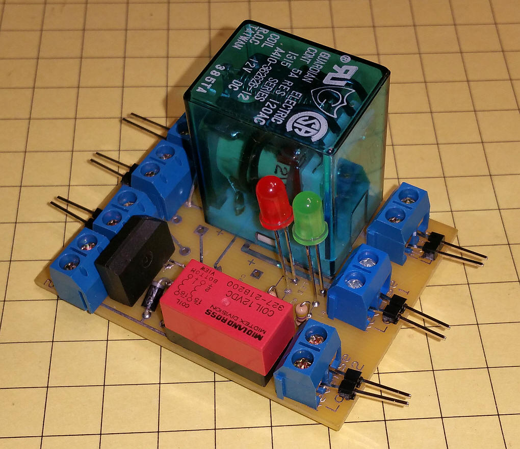 Completed Unit The controller was constructed on a prototyping board. The primary relay is in the upper right with the latching relay bottom center (the orange object). DC power and AC from the power supply connect on the left. The two reed switches connect top center with the center contact being a common connection. The two small round objects below the reed switch terminals are test buttons that simulate the reed switches being hit. The two LEDs (one is on in the center) indicate the state of the relay. One is blue and one is green. The main line connects just below the relay and the two reverse loops go to the two pairs of terminals below it. The LEDs in the lower right are for testing.