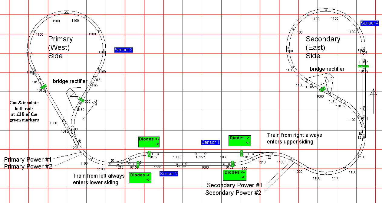 Program Operation: Both engines start somewhere on the mainline other than an isolated section. When an engine crosses a sensor on an isolated block in the reversing loop it triggers a DPDT relay and voltage is reversed. The bridge rectifier keeps the engine moving forward until it clears the block. When an engine enters its crossing siding it stops when it crosses the open gap in the track. It also triggers its crossing block sensor. When the circuit finds that both engines have returned to the crossing blocks the polarity of both relays is reversed and the engines continue on their way through the diodes at the other end of the crossing block. Note that the system does not automatically accelerate or decelerate the engines when starting or stopping - this will be added in the next revision, I hope!