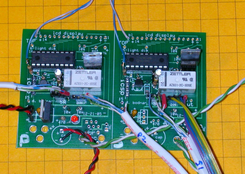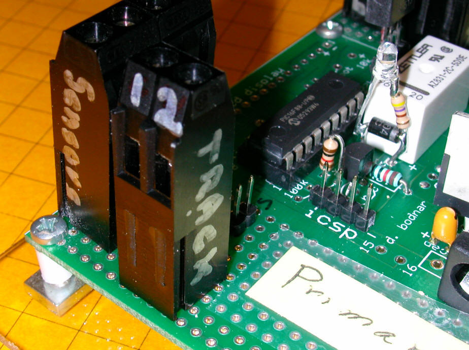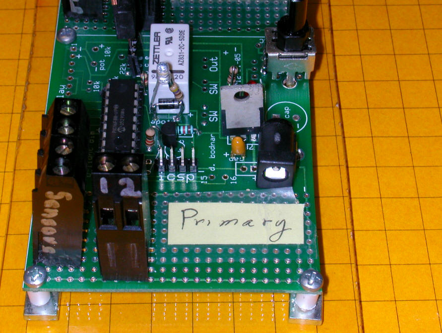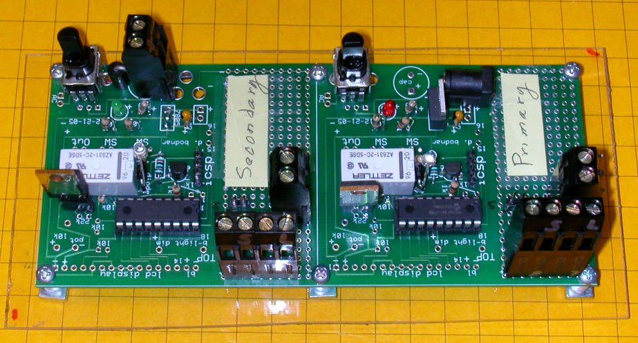 Controller: The prototype controller is shown below - two identical PIC microcontrollers, relays, Mosfets, etc. The reed relays connect just below the white boxes (relays). Note that the reed relays must be connected by twisted pair cable.